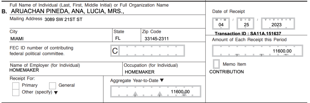 En pesos a la tasa actual, las donaciones totales suman unos 350 millones de pesos y la mayoría no ha sido a nombre propio. El grueso ha llegado a nombre de su esposa, Ana Lucía Pineda, quien se identifica ante las autoridades estadounidenses como ama de casa y es socia de algunas de las empresas.