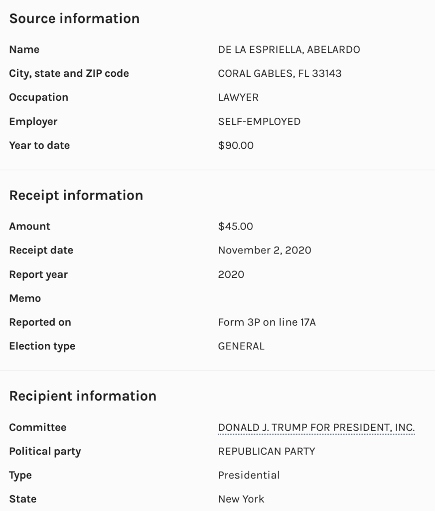Una suma menor, de $457, llegó a las campañas del hoy presidente gringo, Donald Trump. La primera donación a nombre de De La Espriella fue para el comité de Trump Make America Great Again en 2017, según los registros, y la última fue para Donald J. Trump For President, INC. en 2020. No hay registro de que el candidato colombiano haya hecho aportes a la última campaña del presidente gringo.