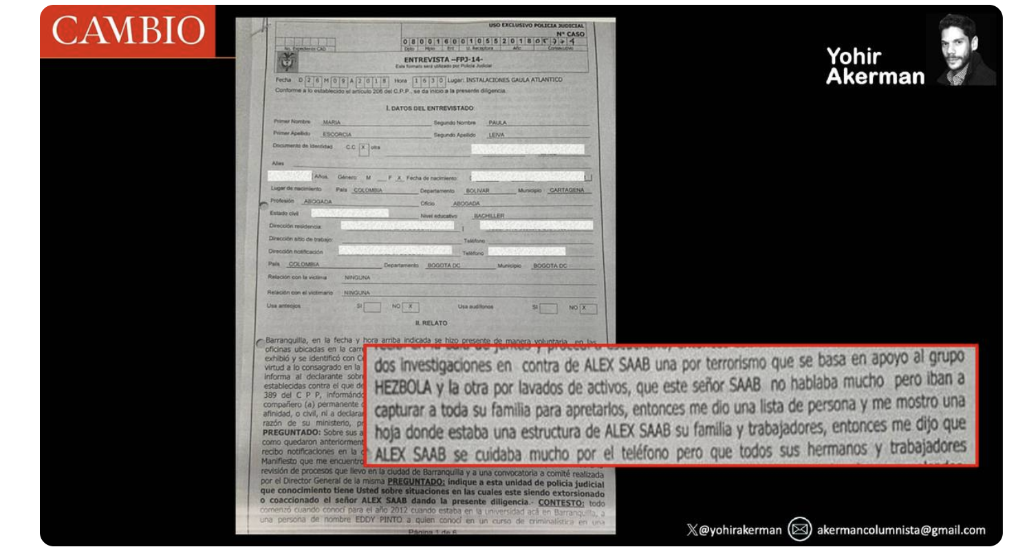 Esa grabación, realizada desde la propia sala de juntas de la firma en Bogotá, nunca apareció en el proceso. Nadie ha explicado dónde está. Misteriosamente desapareció. Pero sabemos que, en esa primera reunión a 22 días del fallido operativo de la Policía y la DEA, de acuerdo con la declaración de Escorcia, Pinto le dijo que Alex Saab enfrentaba dos investigaciones: una por lavado de activos y otra, más delicada todavía, por apoyo a Hezbolá, el grupo terrorista chiita libanés y brazo armado y financiero del régimen iraní. Pinto habló de capturas inminentes en las que se mencionó a la exesposa de Saab, a su madre y a sus hermanos.
