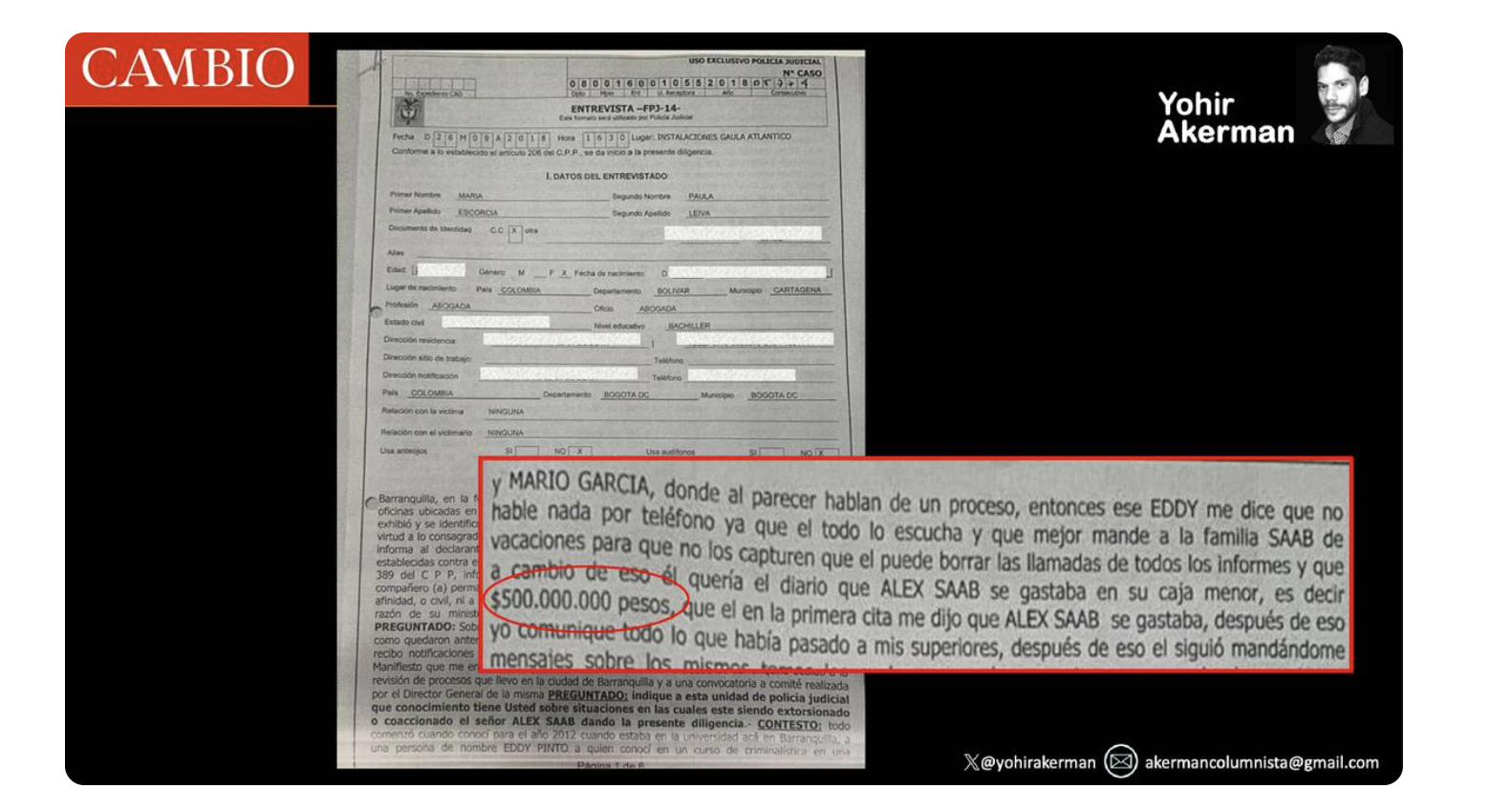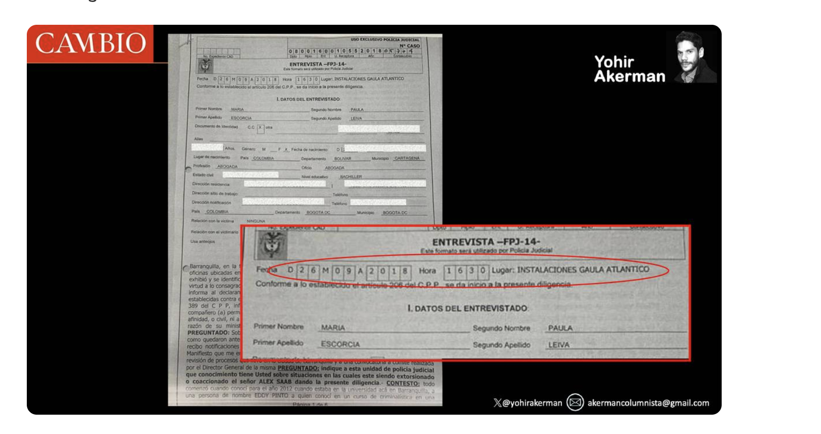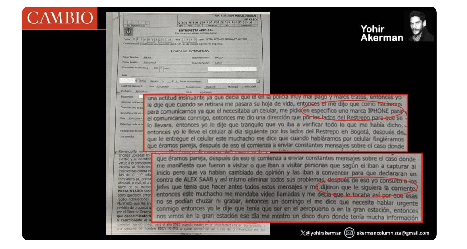Esta es la línea de tiempo. El 1 de septiembre de 2018, el patrullero de Policía Eddie Andrés Pinto Rúa, que tenía una posición privilegiada en la investigación contra Saab y su entorno por trabajar para la sala de interceptaciones Rojo del SIU-Dijín, contactó a María Paula Escorcia, en ese entonces abogada de la firma De la Espriella Lawyers.