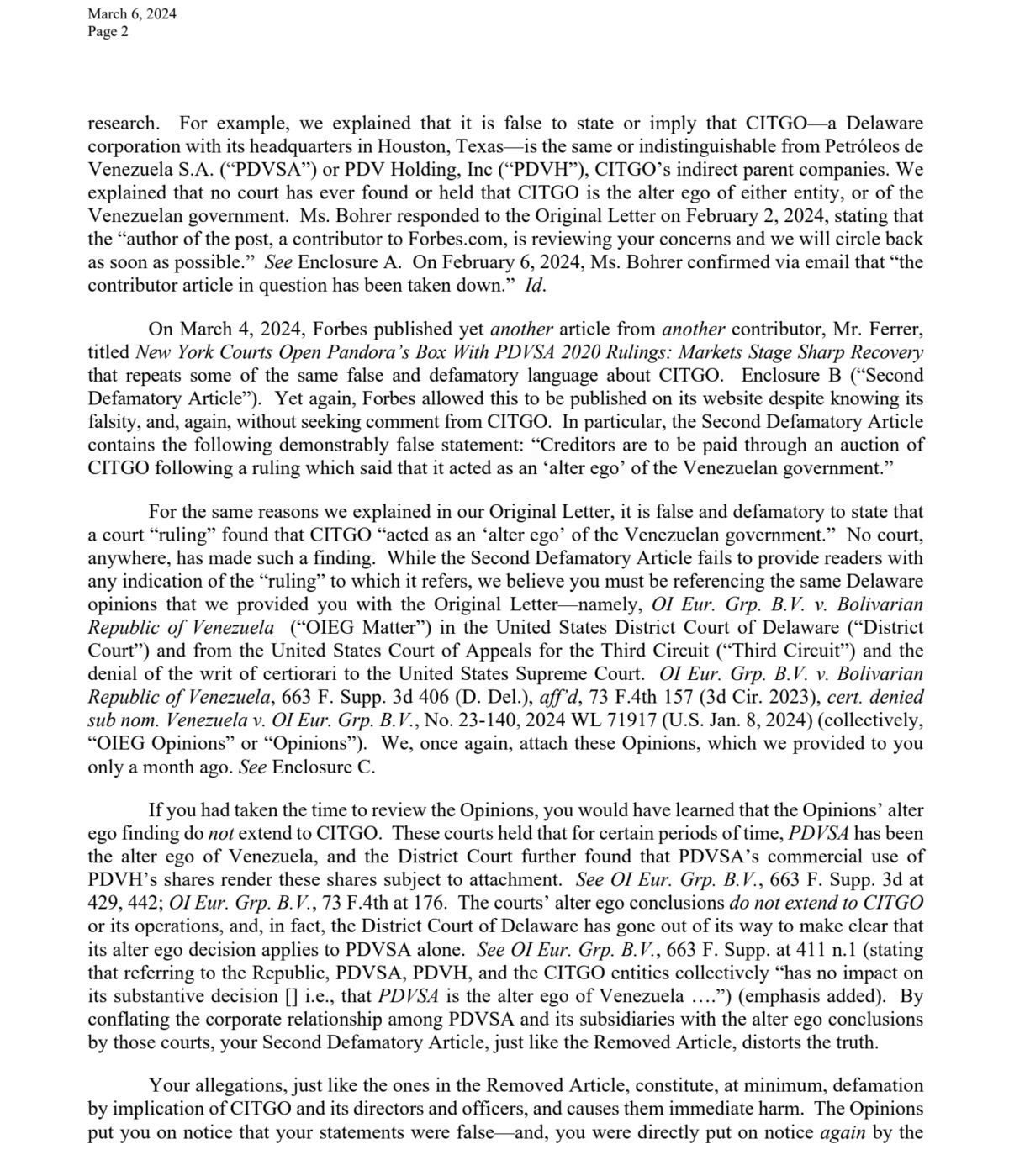 Según la carta, el primer artículo supuestamente difamatorio que tuvo que ser removido de la plataforma de Forbes fue escrito por un colaborador llamado Ariel Cohen, y se tituló «Venezuelan Legal Drama Shakes Energy Markets» (Drama legal venezolano sacude los mercados energéticos). La carta menciona que después de que CITGO objetó ese artículo inicial, Forbes lo retiró, pero luego publicó un segundo artículo del colaborador Elías Ferrer que contenía declaraciones similares que CITGO considera falsas y difamatorias.