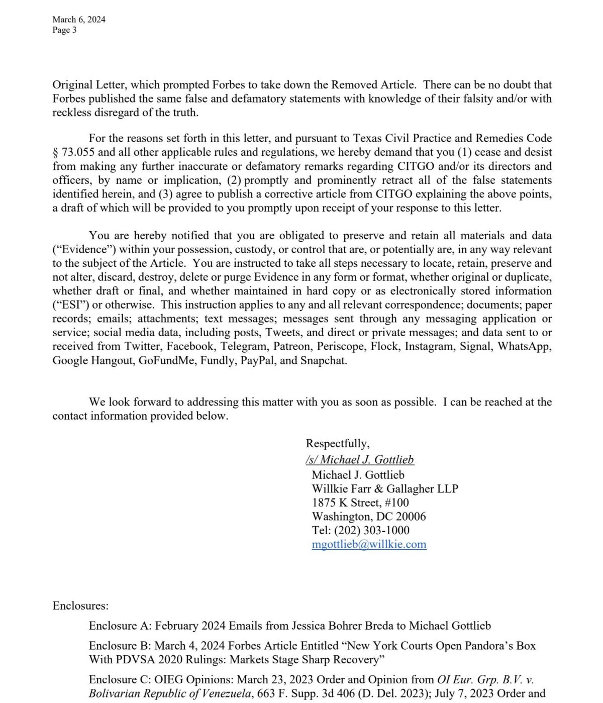 La carta jurídica exige a Forbes que cese de difundir declaraciones inexactas sobre CITGO, retracte los comentarios difamatorios identificados y publique un artículo correctivo redactado por CITGO. Además, insta a preservar toda la evidencia relacionada con el caso.