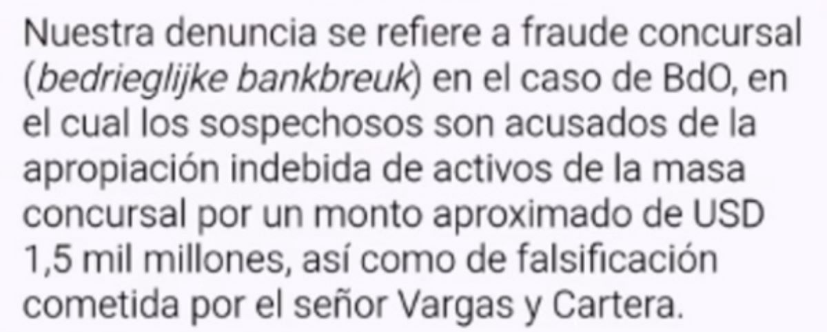 La acusación es demoledora y se fundamenta en cargos de extrema gravedad. Se les imputa la presunta comisión de fraude concursal, conocido en la legislación local como *bedrijflijke bankreuk*, a través de la apropiación indebida de activos pertenecientes a la masa concursal por una cifra de aproximadamente 1.500 millones de dólares. Por si fuera poco, la denuncia también contempla el delito de falsificación, atribuido directamente a Vargas y a su principal vehículo inversor, Cartera de Inversiones. Este movimiento judicial no es un hecho aislado, sino la formalización de una batalla que busca recuperar los fondos de miles de ahorristas damnificados.
