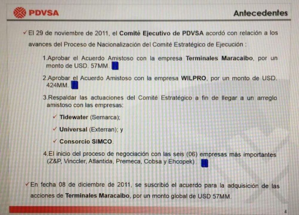 En documentos, también se mencionan tratados de la Estatal Petrolera con empresas como Tidewater (Semarca), Universal (Exterran), el Consorcio SIMCO y hasta un acuerdo con la empresa Wilpro por un monto de 424 millones de dólares.