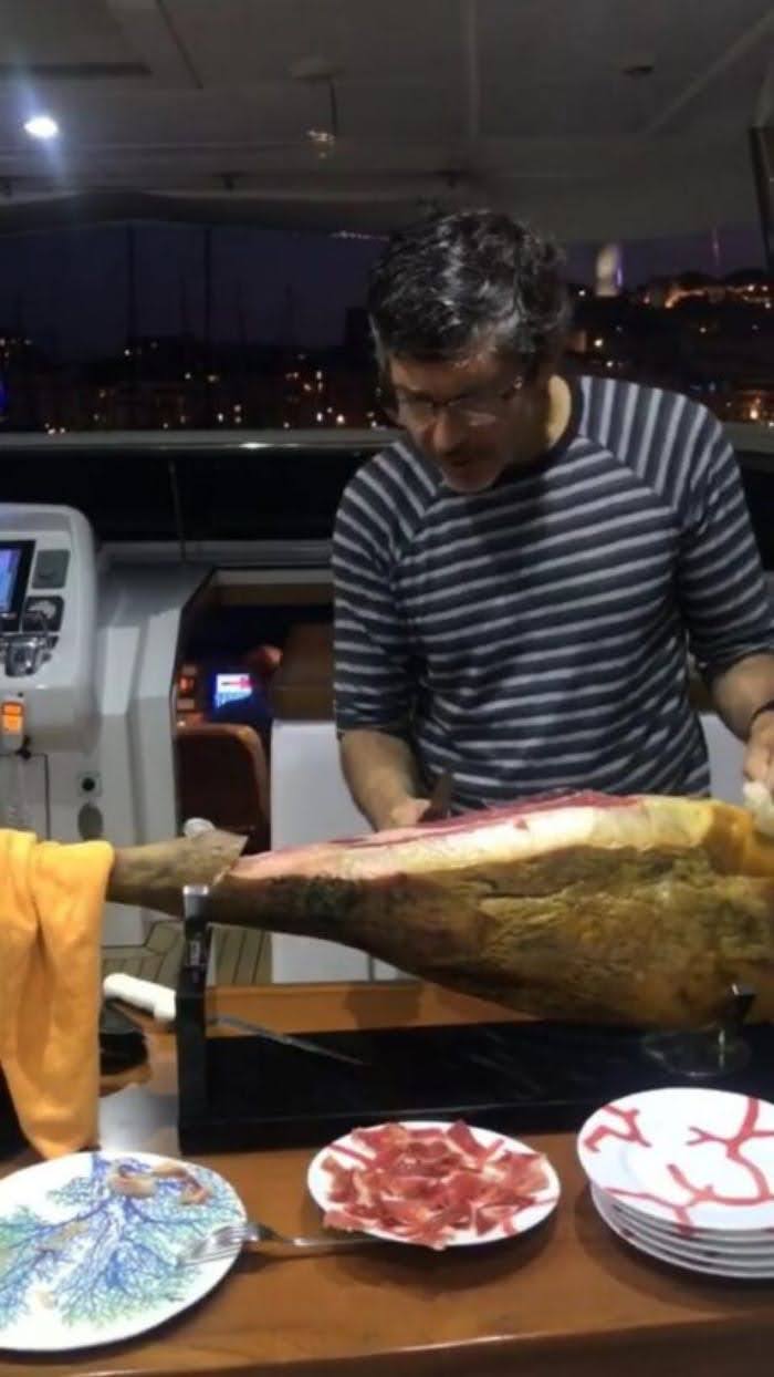 El empresario Miguel Ángel Capriles López parte una pierna de jamón de Jabugo por valor de 3500 euros. La escena sucedió recientemente en un extravagante bautizo del nieto del empresario, quien hace vida en España, al que habría sido invitado el político venezolano Leopoldo López, íntimo amigo de la familia.