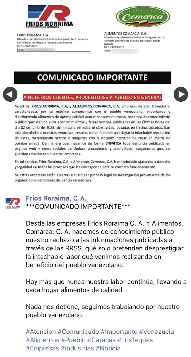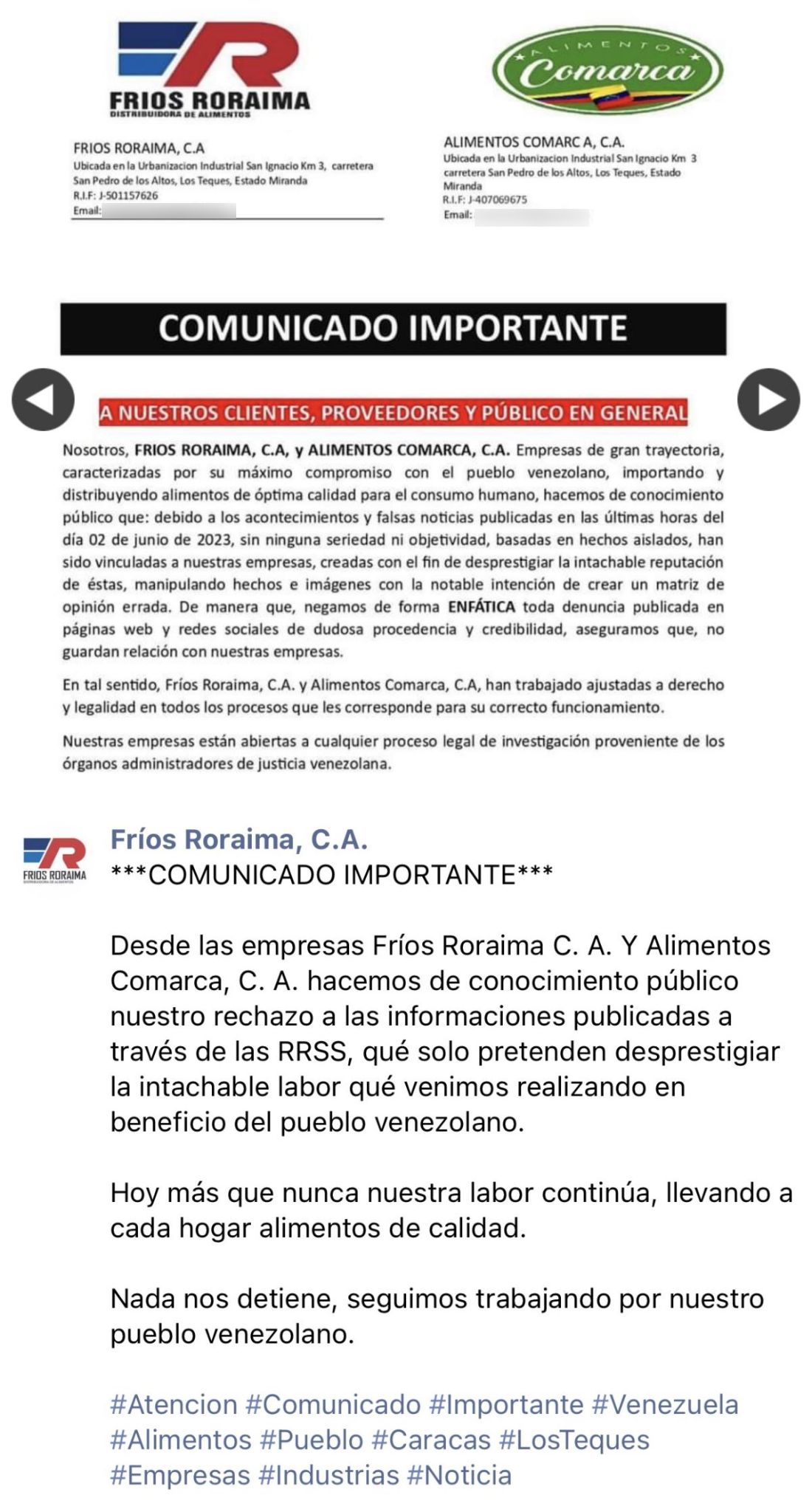«A NUESTROS CLIENTES, PROVEEDORES Y PÚBLICO EN GENERAL Nosotros, FRIOS RORAIMA, C.A, Y ALIMENTOS COMARCA, C.A. Empresas de gran trayectoria, caracterizadas por su máximo compromiso con el pueblo venezolano, importando y distribuyendo alimentos de óptima calidad para el consumo humano, hacemos de conocimiento público que: debido a los acontecimientos y falsas noticias publicadas en las últimas horas del día 02 de junio de 2023, sin ninguna seriedad ni objetividad, basadas en hechos aislados, han sido vinculadas a nuestras empresas, creadas con el fin de desprestigiar la intachable reputación de éstas, manipulando hechos e imágenes con la notable intención de crear un matriz de opinión errada. De manera que, negamos de forma ENFÁTICA toda denuncia publicada en páginas web y redes sociales de dudosa procedencia y credibilidad, aseguramos que, no guardan relación con nuestras empresas.