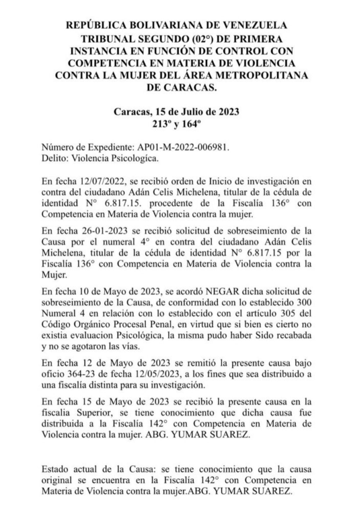 La Fiscalía 136 con Competencia en Materia de Violencia contra la mujer inició una investigación contra Celis Michelena en 2022, luego de recibir la denuncia de Uzcátegui Carrillo. El 10 de mayo de 2023, el tribunal negó el sobreseimiento de la causa, argumentando que no se habían agotado todas las vías para recabar una evaluación psicológica del acusado. El 12 de mayo, la causa fue remitida a otra fiscalía para su investigación. El 15 de mayo, la Fiscalía Superior recibió la causa y la distribuyó a la Fiscalía 142 con Competencia en materia de violencia contra la mujer. Celis Michelena deberá comparecer este miércoles 18 de julio ante el Ministerio Público para responder por los hechos.