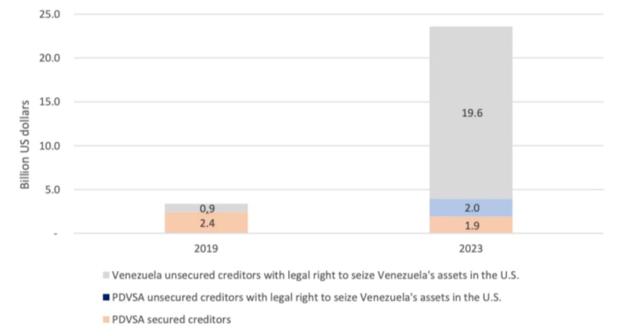 Ahora, veamos qué pasó con ese número. En los últimos cuatro años –bajo la supervisión del gobierno interino liderado por la oposición– los pasivos adeudados a los acreedores con derecho legal a embargar acciones de Citgo se multiplicaron de 3.400 millones de dólares a 23.600 millones de dólares: