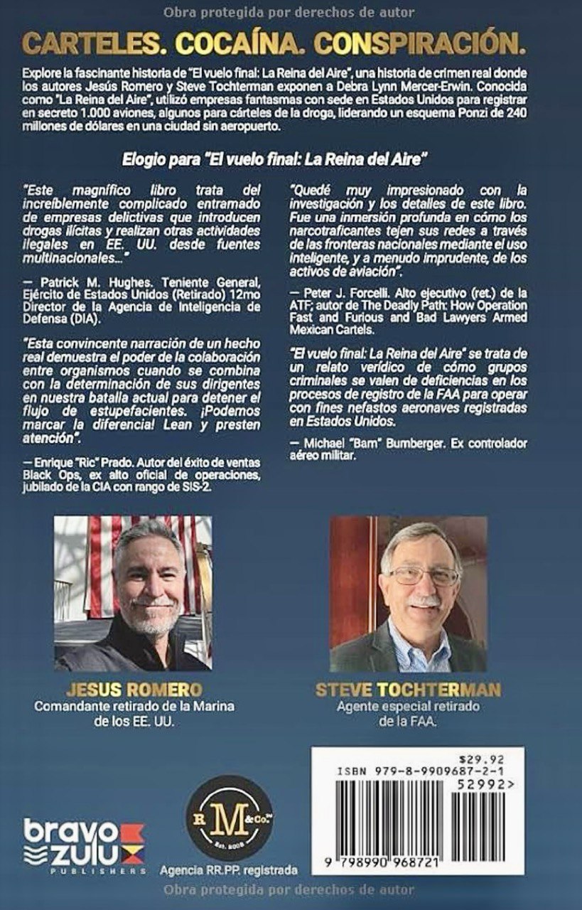 “Para que el plan y la relación funcionaran, los envíos de cocaína debían transportarse de manera rápida y eficiente, lo que requería el uso de aeronaves. Los envíos a los Estados Unidos se realizaban principalmente a través de América Central y México, controlados por el Cártel de Sinaloa y el Cártel de Jalisco Nueva Generación. Este sería un proyecto de 120 toneladas métricas de cocaína que garantizaría, en su mayoría, entregas seguras y sin disputas. Aquí es donde entra Debra Lynn Mercer, la Reina del Aire”, afirma el Comandante Romero.