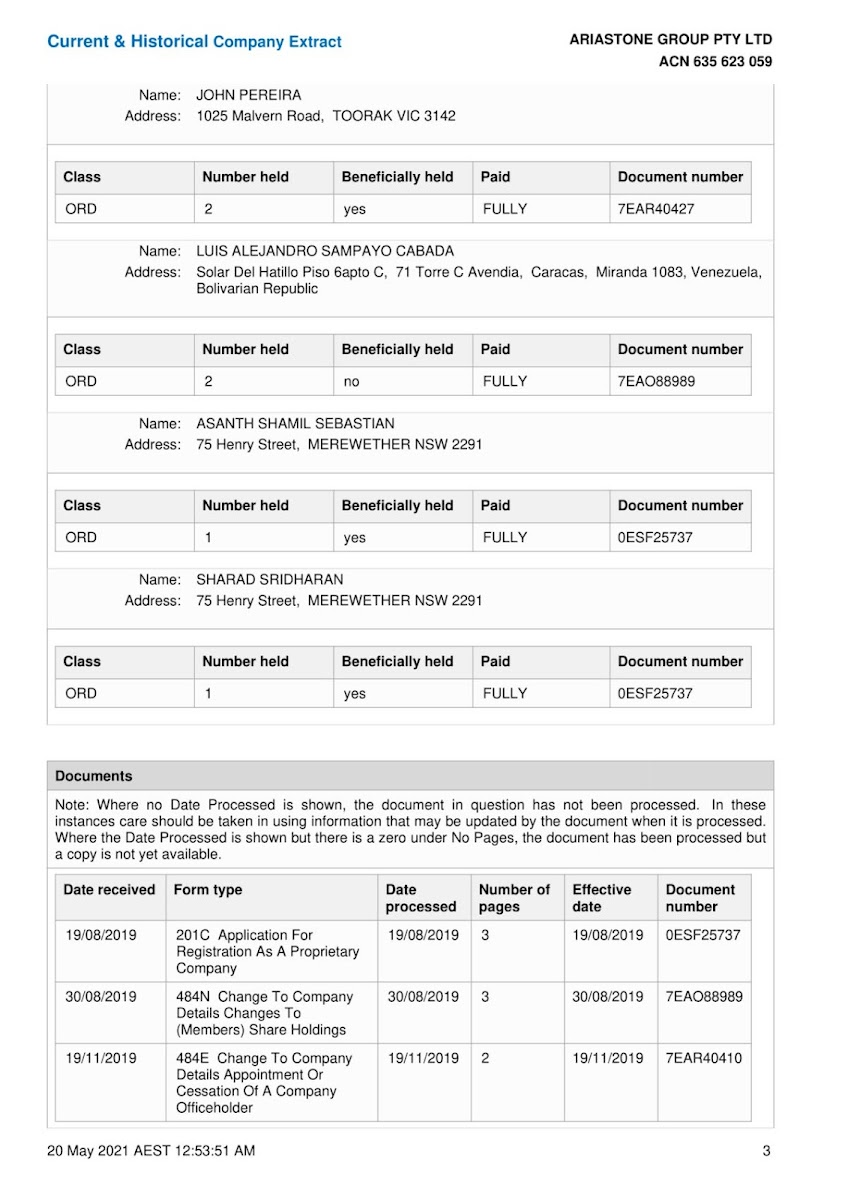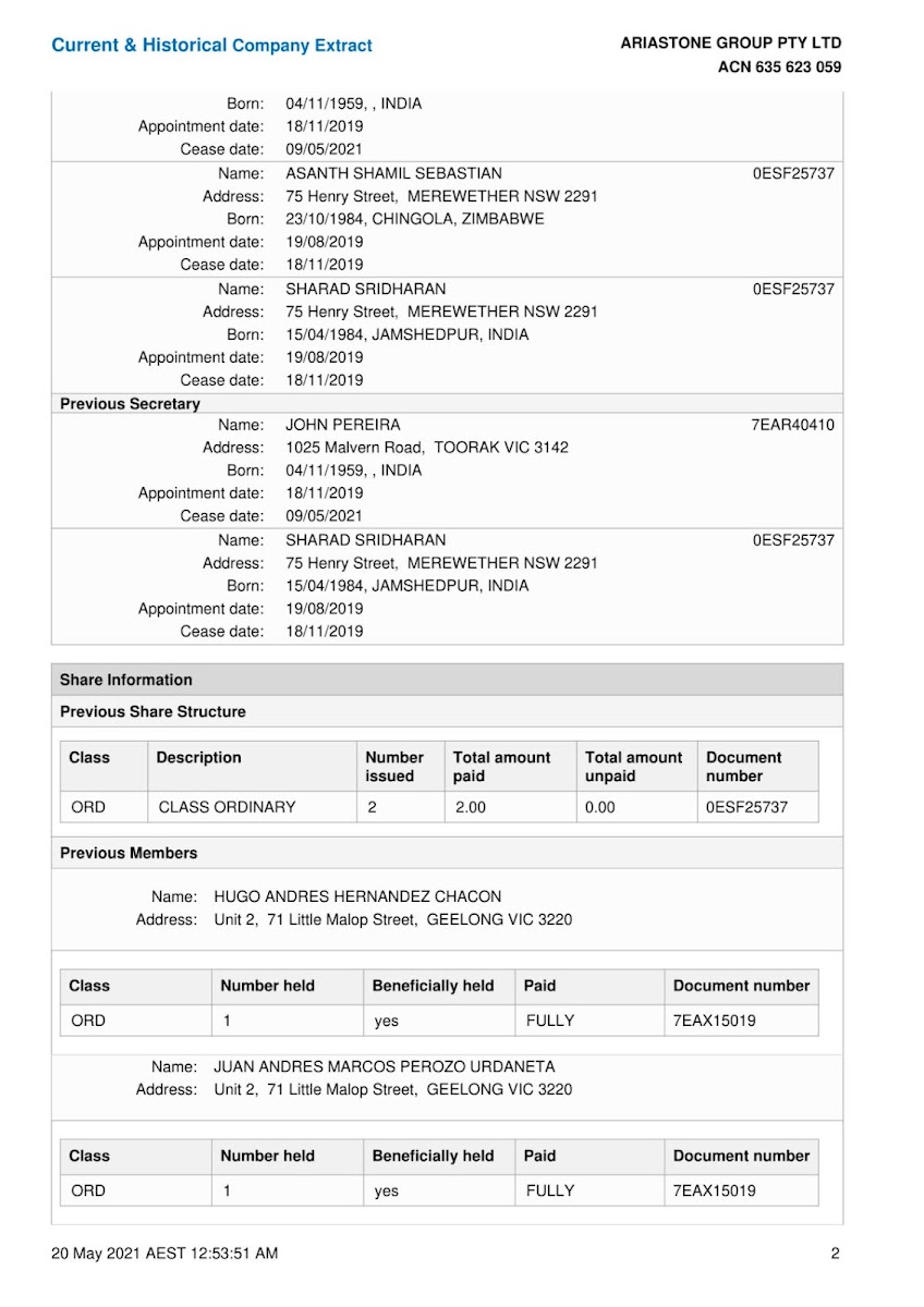 Los documentos mercantiles revelan que Hernández Chacón y Perozo Urdaneta compartieron el capital social de Ariastone Group Pty Ltd con otro venezolano llamado Luis Alejandro Sampayo Cabada, y con tres empresarios extranjeros: Jhon Pereira y Sharad Sridharan, ambos de la India, y Asanth Shamil Sebastian, oriundo de Zimbabue. De estos socios se consiguen pocos datos en internet.