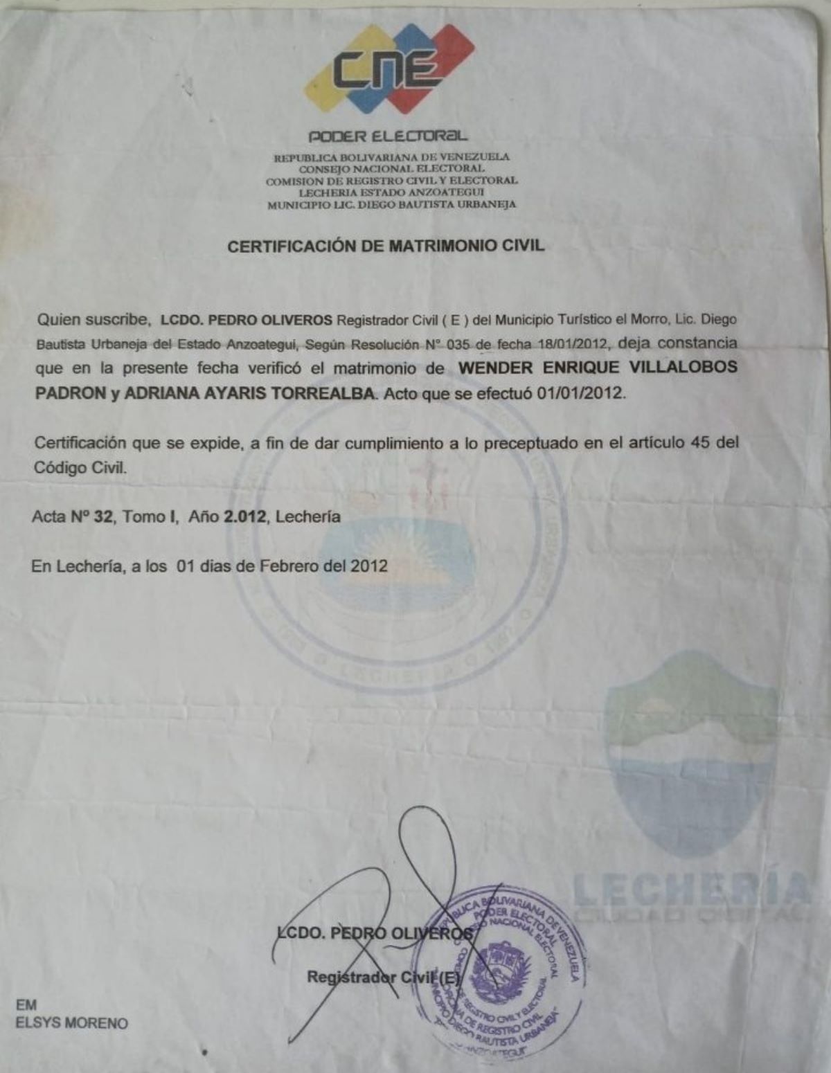 Certificación de matrimonio entre Wender Villalobos y Adriana Torrealba, con error tipográfico en una de las fechas, en la que se menciona la fecha correcta de la boda: 01 de febrero de 2012.