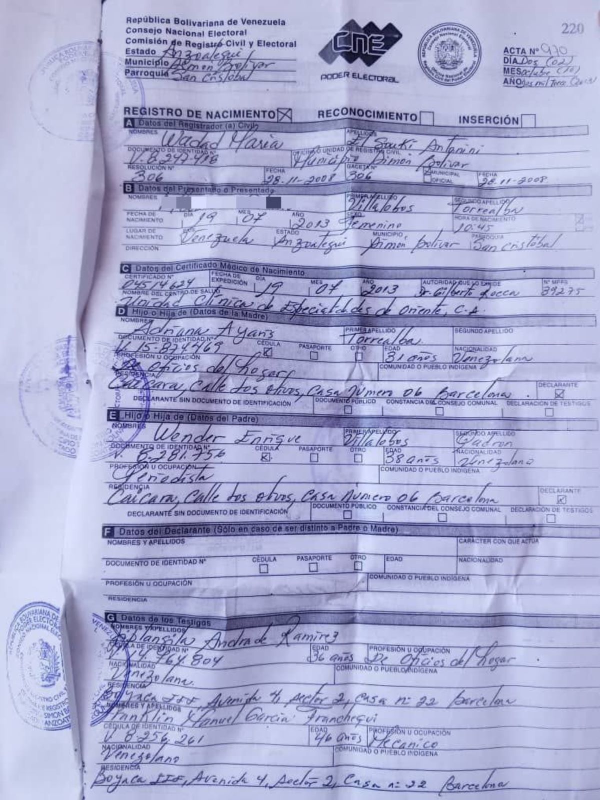 Certificación del acta de nacimiento de M.V. Villalobos (la niña a la que Wender Villalobos desconoce como su hija).