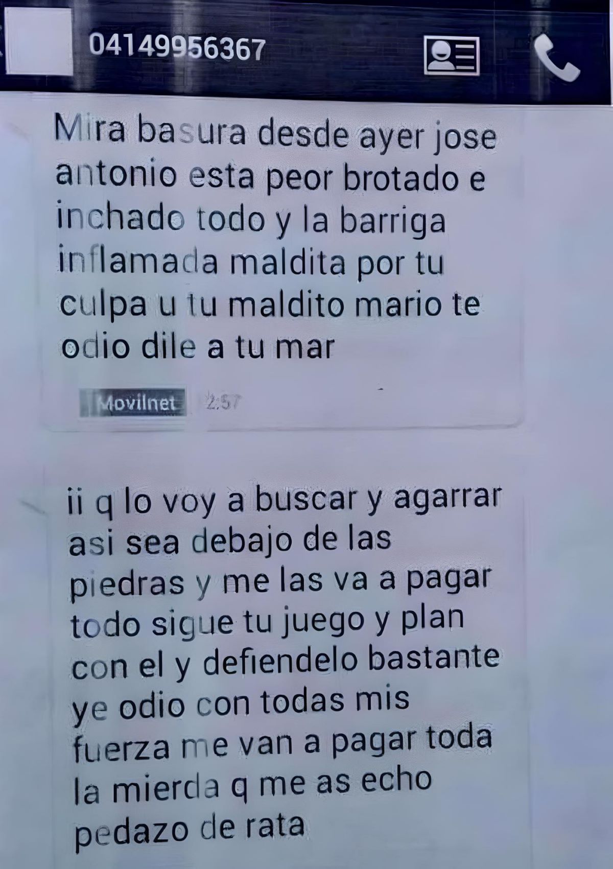 Captura de pantalla de mensajes telefónicos presentados por Adriana Torrealba en sus denuncias ante las autoridades en Venezuela, como evidencia de amenazas recibidas por parte de Wender Villalobos Padrón