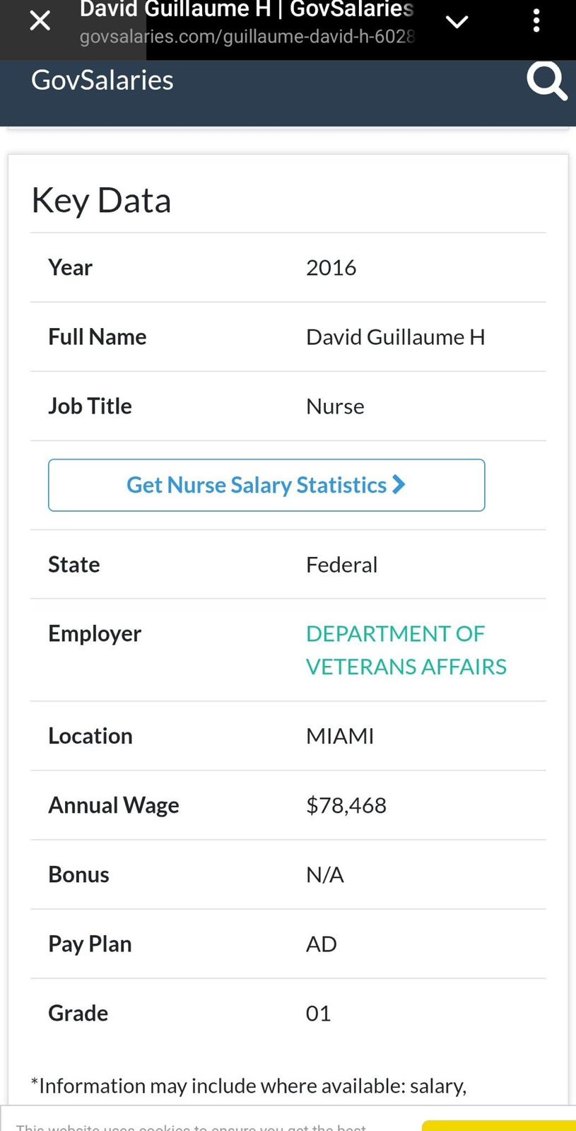 Este dato puede ser corroborado en la página govsalaries.com, que ofrece información sobre los empleados y salarios en la administración pública de Estados Unidos. Guillaume tiene cinco registros y sus ingresos anuales variaron entre 73,288 dólares en 2015 y 82,496 dólares en 2019.