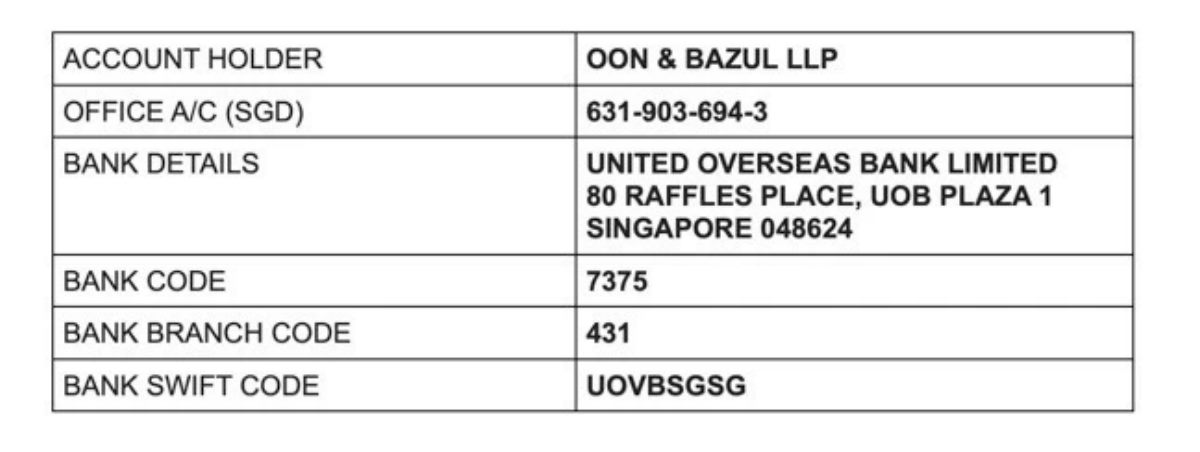 La manera de borrar las restricciones bancarias es utilizando las cuentas de bufetes legales especializados. Las compañías HAC Commodities y Hac Consulting PTE utilizan los servicios del siguiente bufete para recibir fondos.