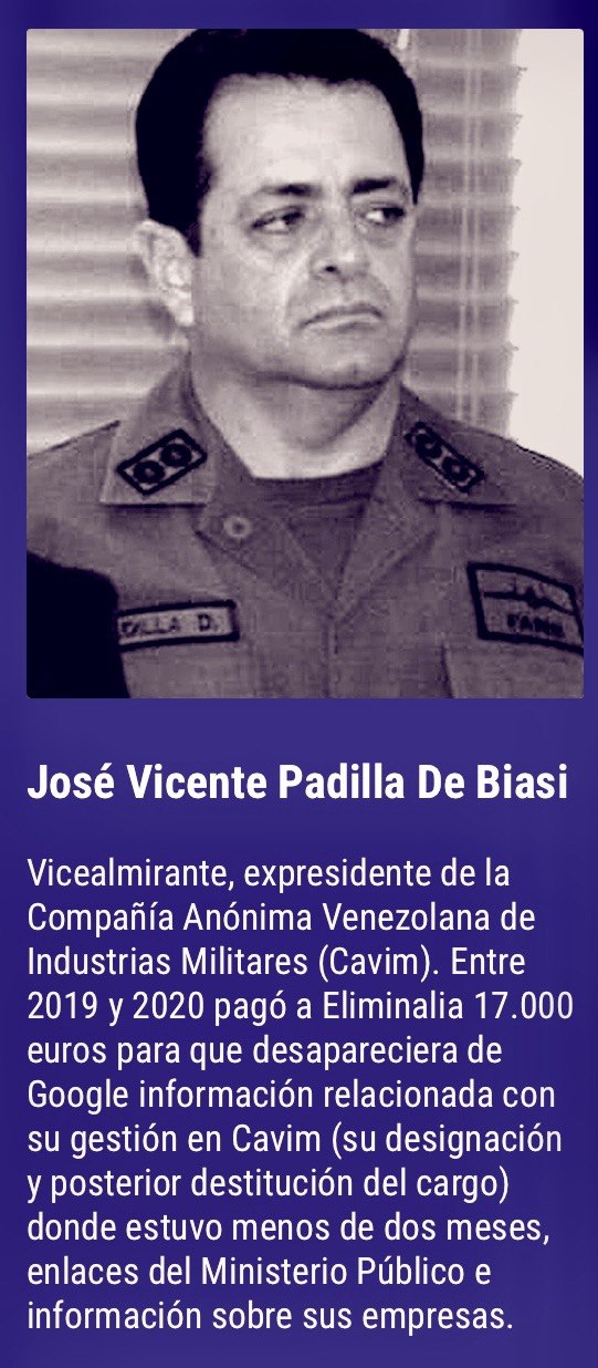 José Vicente Padilla De Biasi ha destinado grandes cantidades de dinero de origen ilícito a desaparecer sus antecedentes de internet, para lo cual contrató los servicios de la repudiada Eliminalia.